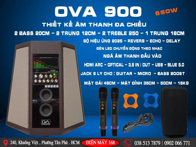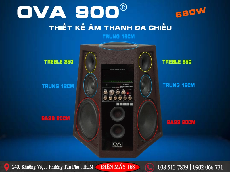 Loa tháp karaoke OVA 900 hát karaoke hay được lấy ý tưởng từ viên kim cương, Với cái nhìn tổng quan từ trên xuống các bạn sẽ nhìn thấy 1 viên kim cương, Cũng như sự kỳ vọng và tập thể kỹ sư âm thanh thương hiệu OVA ngày đêm thực hiện hết kỹ thuật để tạo nên 1 chiếc loa tháp karaoke từ chất âm đến cái nhìn. Đây là dòng loa tháp đáp ứng được nhiều dòng nhạc, Từ thể loại nhẹ nhàng acoustic hay nhạc trữ tình hoặc nhạc sống đều thể hiện rất hay bới trên hệ thông loa tháp 3 đường tiếng này khai thác hết dãi âm trầm uy lực là 2 bass nén 20cm , Âm trung thanh thoát cho giọng hát hay chi tiết nhac cụ được phục trách bởi 1 loa trung 16cm & 2 loa trung 12cm, 2 loa treble 250 thể hiện chi tiết dâĩ âm bổng sáng và nghe tí tách.