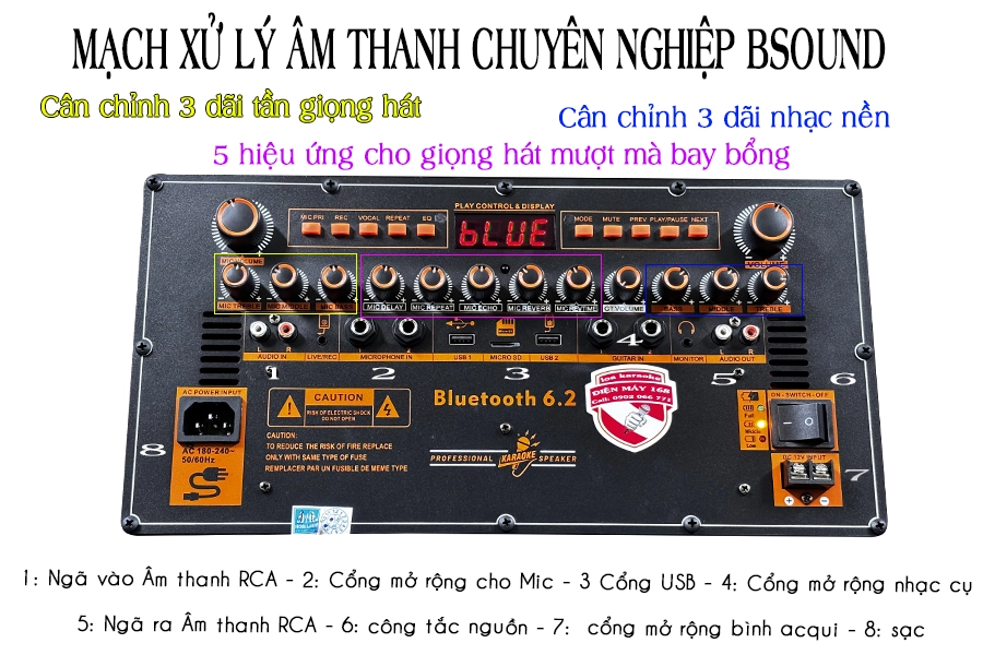 Bsound 1 hỗ trợ kết nối Bluetooth lên đến 6.2, USB, ARC in / Out, và thẻ nhớ TF, cho phép bạn dễ dàng phát nhạc từ điện thoại, máy tính bảng, Tivi hoặc các thiết bị lưu trữ khác. Kết nối không dây bluetooth 6.2 mang lại tín hiệu âm thanh cao nhất và ổn định giúp bạn thuận tiện hơn khi sử dụng loa trong các buổi hát karaoke. Tích hợp 2 cổng mở rộng cho micro và 2 cổng mở rộng 6 ly cho nhạc cụ. Ngoài ra chúng ta có thể EQ vocal là cân chỉnh giọng hát 3 dãi tần chi tiết, Điểm nỗi bật là bộ 5 hiệu ứng Echo, delay- repeat - Reverb và Reverb time giúp cho giọng hát của bạn bay bổng hơn.