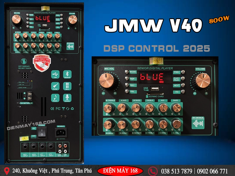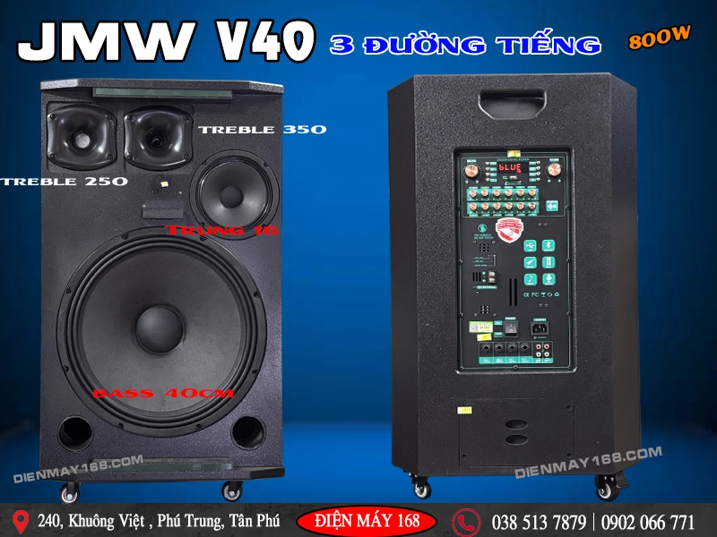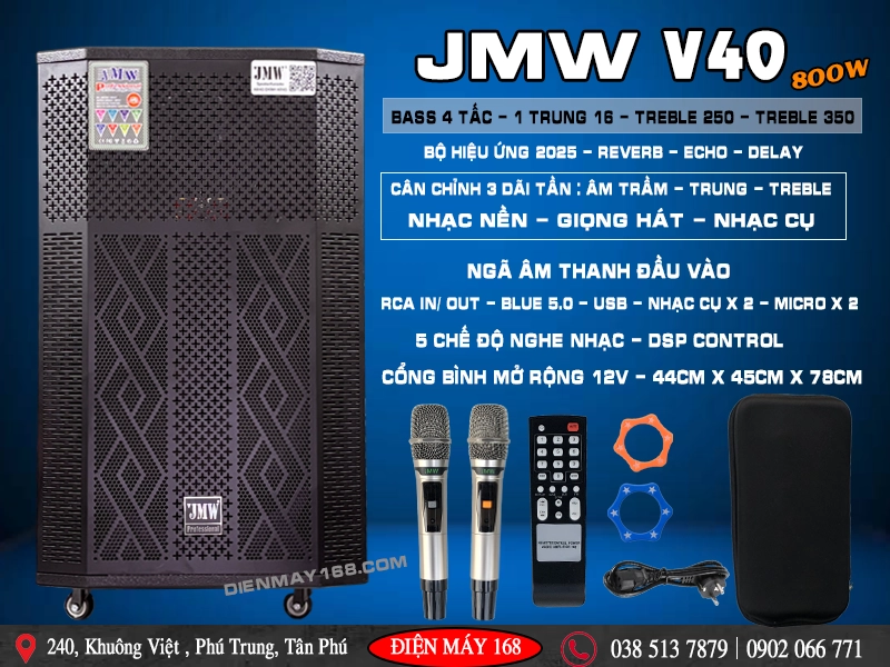 Với cấu hình loa kéo 3 đường tiếng thùng gỗ công suất lớn JMW V40 sở hữu Bass chủ lên đến 40cm và 1 Loa Trung phụ trách chi tiết giọng hát và dãi âm trung nhạc nền lên tới 16cm. 1 Loa Treble 250 hỗ trợ giọng hát sáng rỏ bay hơn, 1 Treble 350 phụ trách âm bổng nhạc nền và đi kèm mạch xử lý âm thanh DSP Control chính hãng JMW mang lại tổng thể chi tiết âm thanh sôi động. Bên cạnh đó đôi tay Micro Không Dây Cao Cấp sử dụng tần số UHF giúp tái tạo giọng hát đầy đặn 3 dãi tần nội lực , Hát rất nhẹ cũng như cho phép chúng ta thay đổi tần số " trường hợp bị trùng tần số với loa hàng xóm, Điểm mạnh là tăng giảm độ nhại giúp cho các bạn hát nhẹ nhàng và chi tiết nhất.