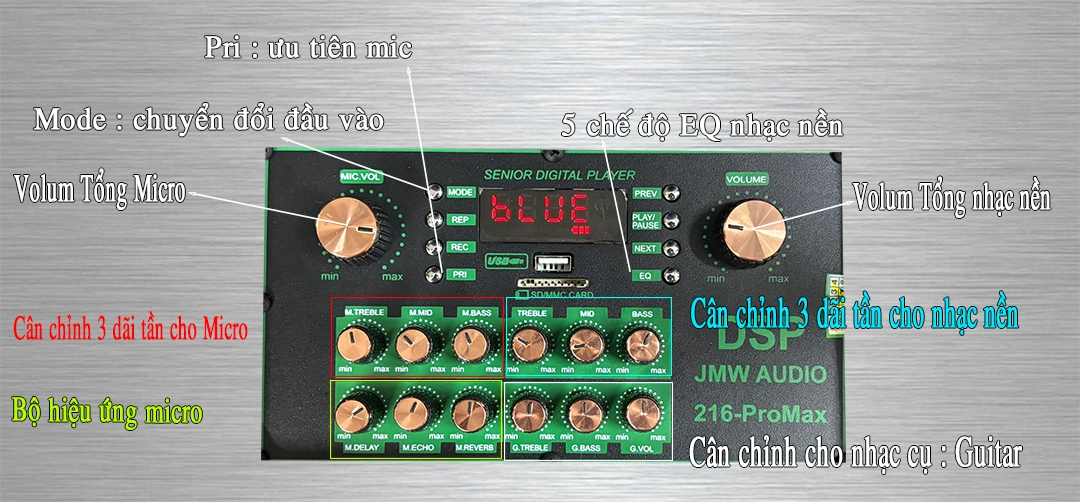 Mạch DSP thế hệ mới được nhà máy JMW phát triển cho chi tiết 3 dãi tần rỏ và chi tiết giọng hát sáng bay và mượt mà bởi bộ 3 hiệu ứng : Reverb , Echo , Delay và chúng ta có thể cân chỉnh giọng hát hay còn gọi là EQ vocal cho giọng hát của các bạn tròn vành rỏ chữ 3 dãi tần giúp giọng hát chuyên nghiệp hơn khi hát karaoke hoặc phát biểu các buổi hội hợp hoặc giải trí cùng gia đình.